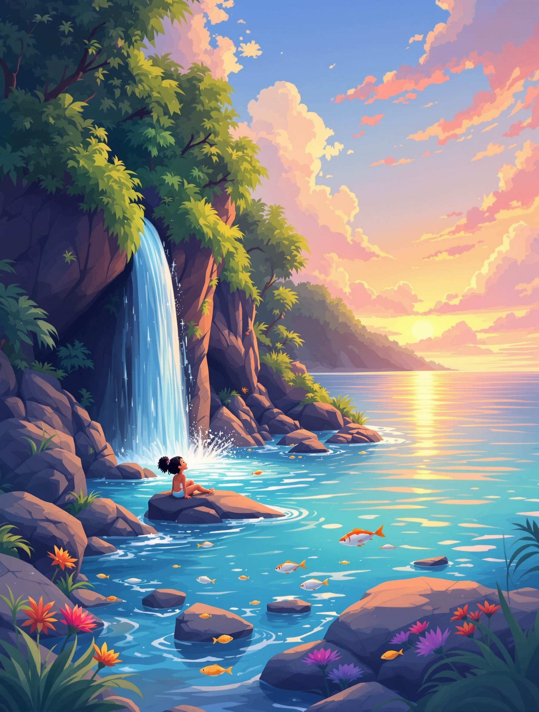 Little Maya lived on the beautiful island of Cebu in the Philippines. Every morning, she climbed the tall green hills near Osmeña Peak and looked out at the sparkling blue sea. One day, she discovered a hidden waterfall called Kawasan, where crystal water tumbled over colorful rocks. Silver fish danced beneath the surface! Maya splashed and laughed with joy. In the afternoon, her grandfather told stories about brave explorers who once visited their shores long ago. At sunset, Maya watched the sky turn pink and gold over the islands. She smiled, knowing Cebu truly was a gateway to a thousand journeys.